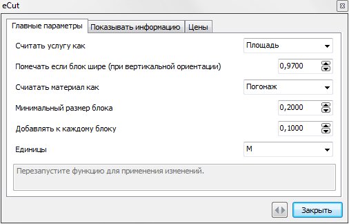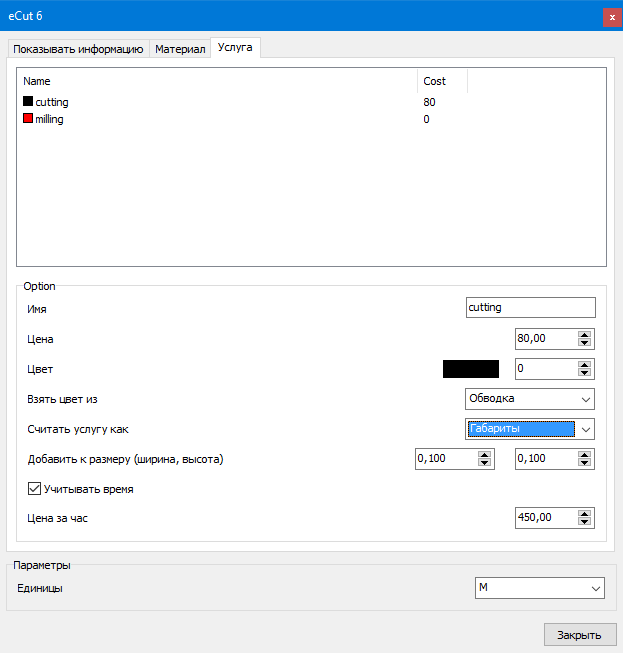 Считать услугу как - позволяет выбрать метод определения услуги - погонные метры реза, либо квадратные метры.