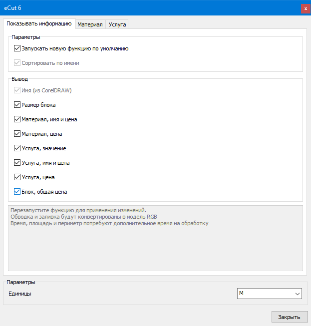 [Компоновка][Вывод на плоттер и контурная резка][Периметр][Площадь][Калькулятор цены][Машинное время][Вспомогательные линии][Тираж][Прямоугольный раскрой][Диоды][Неон][Печать эскиза][Средняя линия][Умное деление][Соединить открытые пути][Сглаживание][Поиск пересечений][Поиск дубликатов][Поиск объектов][Создать кассету][Создать линии][Создать сетку][Создать печатные метки][Упростить кривую][Векторные эффекты][Боковой разворот][Создать файл для контурной резки][Разделит объект][Удалить дублирующиеся грани][Разрезать объект][Расставить люверсы][Создать окантовку][Выравнивание][Задать размер][CAD функции][DXF экспорт][Заменить объекты][Относительное масштабирование][Создать перемычки][Переменные][Резка струной][Оптимизатор пути][Коробка шип-паз][Объект шип-паз][Калькулятор объема][Дверные фасады]
