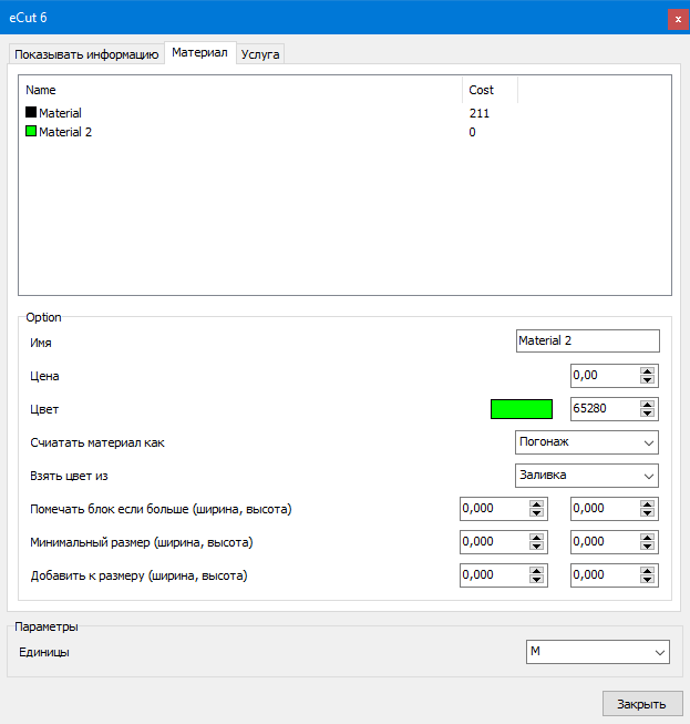 Во вкладке материалы вы можете добавлять свои материалы и указывать плагину как рассчитывать цену за материал. Все параметры понятны и в подробном описании не нуждаются.