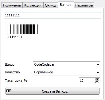 Программа может генерировать Barcode, в данной вкладке можно задать их параметры, а так же создать отдельный одиночный объект.